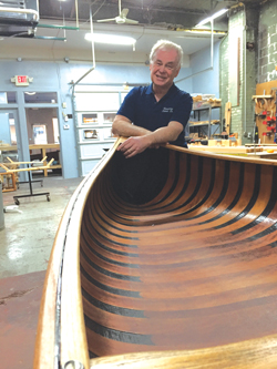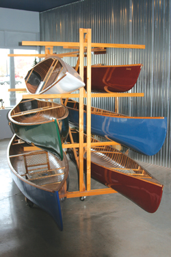 On the Move The design and build method of the Merrimack/Navarro canoe was born of innovation and the passion to continue a tradition of beauty. Vernon’s grandfather, Lemuel Beach, Sr., a hunting and fishing guide in Maine, didn’t like the newfangled all-fiberglass canoes entering the market. Beach’s passion for aesthetics led him to develop a hybrid of beauty and performance, or as he put it, “a fiberglass canoe that looked like a canoe.” He integrated wooden ribs and decking into a thin fiberglass hull, creating a stiff, lightweight canoe that retained the classic look. Fiberglass (or now Kevlar) used in place of the traditional canvas made maintaining the hull easier. A Navarro can last for generations with an annual coat of marine wax on the exterior of the hull and some oil wiped on the wood. Pew moved Navarro to Talent, Ore., and expanded it. By 1997 he was producing 730 canoes a year, thanks in part to a handful of new hull designs from renowned canoe designer Bob Foote. In 2004, as Pew approached retirement, he sold the business to John Wiesendanger, who moved the company back to California. It soon changed hands again and landed in Minnesota. Navarro struggled at its new home, and a few years later Bruce and Sue Peterson saw a post on Craigslist offering the company for sale. The Petersons were planning to move to the Quad Cities area, but Bruce was unable to find a job in his profession, hospital administration. They decided to give canoe building a try. In 2011 they bought the company and moved it to its current home, a few blocks from the Mississippi River in downtown Rock Island, Ill.