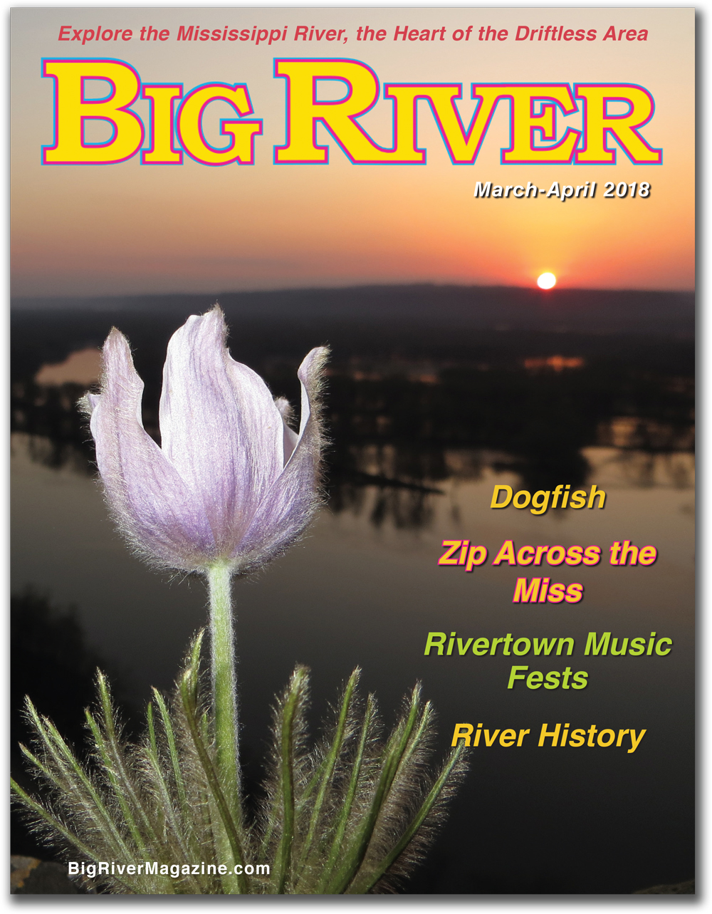 The panoramic scene is best captured in the early morning or late evening, when the sun turns the surrounding bluffs into a gilded paradise. If you feel adventurous, hike from Camp Hennessy to the overlook at night to enjoy the fantastic view of a thousand twinkling stars over the Mississippi. In the early spring, wander the ridge to find pasque flowers or prickly pear cacti growing on the dry rock outcrops. Then kick back and soak up the sun on the ridge top in a sea of prairie grass. Keep your eyes focused on the big blue skies for the fastest bird on earth, the peregrine falcon. In spring, peregrines, or “long-wings” as they are called, launch into remarkable aerial flights and courtship calls along the Upper Mississippi bluffs. After courtship, they nest in steep rock outcrops along the river. Falcon males are a third smaller than females. In their affinity for peregrines, Woodland cultures built bird effigy mounds near peregrine eyrie sites. Two effigy mounds north of Paint Rock closely resemble a pair of raptors side by side, with one of the birds having a wingspan of 227 feet while the other is about a third smaller — 141 feet. We continue to honor the peregrine falcon, on the Iowa Hawkeyes logo. In the 1960s, due to the use of DDT, peregrines disappeared from the Mississippi River valley. They were listed as a federally endangered species until 1999. In 2000, wild peregrines began reproducing again along the valley for the first time in over three decades. Now 21 pairs nest in Iowa, with 17 of them on the Mississippi. A backpack trek uphill can be a physical and emotional challenge, but falling asleep fireside under a blanket of stars, then greeting the sunrise on a rocky summit is a more than ample reward. A visit to a place like Paint Rock encourages us to walk in gratitude and celebrate our connection to this beautiful and mysterious Earth. # Brian Gibbs lives in Elkader, Iowa. This is his first story for Big River. March-April 2018 © Big River Magazine |