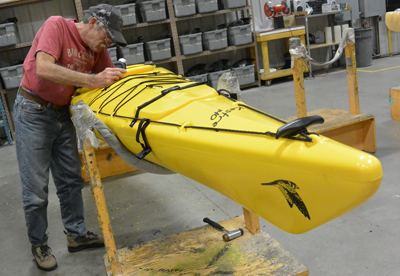 More than Canoes In 1999 the Wenonah Canoe family decided to grow as well. As the sport of kayaking began to blossom, Wenonah canoe started designing and building kayaks to add to its lineup. The Wenonah kayaks performed well, but Cichanowski felt they lacked a certain shelf appeal. After years of informal collaboration, Wenonah acquired Current Designs kayaks, which was based in Victoria, British Columbia. The company was struggling with logistical problems caused by its isolated location. A new factory was opened in Canada, but despite five years of hard work, problems continued. A tough decision was made to move the kayak operation to Winona. A new facility was built less than a mile from the canoe factory, and by 2004 Current Designs kayaks had earned a “Made in America” sticker. The Current Designs brand expanded to appeal to the full spectrum of kayakers, from casual recreational paddlers to long-distance adventurers. The vacuum bag technology was tweaked to work with the more complex shapes of kayaks and create lightweight Kevlar and composite models. Molds are made of a top and bottom half of the kayak, and once the materials are laid up and the resin has cured, the two halves are joined together. Roto-molded polyethylene plastic boats offer an affordable and durable alternative to their composite counterparts. Much like the Royalex canoes, the production process of the polyethylene kayaks are substantially quicker than the composite models. Grains of plastic are scooped into an intimidating looking steel mold of a kayak and moved into a large oven that looks like an amusement park ride. The oven rocks, rolls and rotates to spread the melting plastic to cover the mold. A complete hull emerges from the mold and is carefully cooled before hatches, seats and other components are installed. In 2011 Wenonah also acquired QCC Kayaks, which makes high-end composite boats. QCC, founded in rural Wisconsin in 1991, was known for building quality kayaks aimed at paddlers looking for an extremely efficient glide while maintaining full touring capabilities. With their long graceful curves, the handful of sleek QCC Kayaks stand out in the Current Designs catalog.