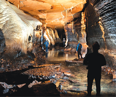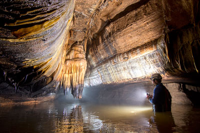 There are hundreds of caves in the bowels of our karst topography of the Driftless Area, where rainwater dripping through limestone crevasses over thousands of years have created miles of hidden caverns hung with spectacular stalactites and stalagmites, like stone icicles. Several “show caves” — Crystal, Niagara, Mystery, Spook, Maquoketa — are open to the public, spectacular and easy to access. Many other hidden treasures lay beneath private property and are kept secret. The only natural entrance to Coldwater Cave was discovered in 1967 by three intrepid souls using rudimentary tools and scuba equipment. After several years of covert cave diving they revealed their discovery to state officials. When Iowa was granted an easement and exploration rights to it they bored a 94-foot vertical tunnel about two miles from the natural opening in 1971, and the full-blown exploration of Coldwater Cave began.