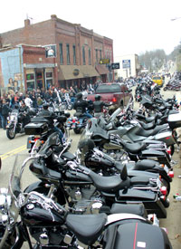 In the village of Maiden Rock, Wis., (pop. 130) Highway 35 is lined with parked bikes, and sometimes riders are backed up for two to three miles on the highway, according to Flood Run organizer Denny. Neil Gulbranson, the chief deputy of Pierce County, claims that they have not had serious problems, because bikers are “99 percent respectful.” He feels that since this is the first trip of the season for many, their driving may be a little rusty. There have been accidents related to the heavy traffic, but not “drunk and disorderly” tickets.