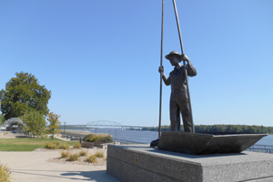 "Mississippi Harvest,” a 28-foot bronze statue by Eric Blome, stands at the riverfront in Muscatine, Iowa. The clammer commemorates when the city was the “Pearl Button Capital of the World.” (Reggie McLeod)
