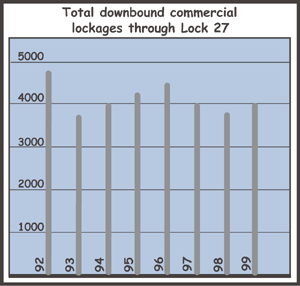 The Corps study, which began in 1993, predicted that barge traffic would increase by 1.5 percent a year. This graph charts the changes in barge traffic at Lock and Dam 27 (near St. Louis).