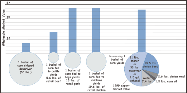 The vast majority of corn grown in the Midwest is fed to livestock. The majority of the barges being pushed down the Mississippi and Illinois rivers are filled with corn destined for export from the Port of New Orleans. The Army Corps of Engineers $57-million Upper Mississippi River-Illinois Waterway System Navigation Study seeks to improve shipping on the two rivers without asking whether it might be better to process the corn near the communities where it is grown, which would create jobs, add value to the crop and reduce the volume of the product. The chart below compares the volumes and wholesale values of various corn products. |