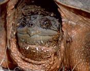 Snapper!By Roger Lacher Wading barefoot in muddy backwaters or knee deep in a trout stream, you stub your toe on something that moves! Your reaction is as predictable and primitive as the creature you picture -- Jurassic jaws clenched on your calf, its small eyes intent in a huge head, neck stretched and wrenching the bone out of your leg, shell like a filthy fossil, cold-blooded claws imbedding the bottom to drag you down. Our image of the snapping turtle is right down there with snakes. Indeed, "chelydra serpentina" translates to "turtle snake," no doubt based on the long flexible neck capable of lightning strikes at food or fools. A more typical encounter occurs from the comfort of a car on highways along the Mississippi. The critter's crossing the road, of course, to get to the other side. Egg-laying sites are select habitats that often parallel our rail and auto corridors. Some turtles get flattened, and some get picked up for supper or sale as fish-market delicacies -- $3.99 a pound at a popular rivertown outlet. This summer mortality of mature females is a factor in Minnesota designating snappers a species of "special concern." John Moriarty of the Minnesota Herpetological Society, suggests that concerned motorists assist road-shoulder snappers by carefully carrying them across, toward their destination, coming or going -- careful not to get bit and gentle not to scare the pee out of them. Lugging a turtle by the tail often causes voiding of the bladder. Since liquid is needed to lay eggs, a shocked snapper may need to go back to the river for a refill in order to complete the annual process -- more stress. Moriarty, co-author of Amphibians and Reptiles Native to Minnesota (University of Minnesota Press), also cites climatological effects on reproduction. The high water and cool temperatures of 1993 resulted in a hatch "close to total failure on the upper Mississippi." This year, this month, let's hope the monster-moms have better luck. The female can be identified by a plastron (belly shell) bulging out instead of indented like a male. At about seven years of age, with a ten-inch shell, she excavates a hole in the appropriate habitat and lays a dozen or more eggs. About two months of sun heats the invisible underground nest to incubate silver-dollar-size progeny who use their unique "egg tooth" to open rubbery ping-pong shells. Recent research suggests that temperature levels during the middle of this period affects the sex of the hatchlings: hotter for females and vice versa. Perhaps it relates to future food supplies. Regardless, the tiny girls and boys dig their way out then run for the water, to disappear. Predators keep a keen eye for a turtle treat. Overhead, herons and crows scan the shoreline. On land, raccoons, skunks, foxes and coyotes will gobble up a whole batch, if they didn't dig up the nest earlier. Underwater, big fish or a bigger turtle may gulp a neophyte. The few that survive the early years get pretty hard to kill by anything but people and their technology. Snapping turtles have evolved to take full advantage of most aquatic environments. They can stay out of water for days, under water long enough to test the temper of the best waiter or way up in spring creeks where other turtles fear to tread. Their diet is catholic: a third vegetation, some fish, a fifth carrion, a few insects and other invertebrates, and occasional vertebrates, such as ducklings. In a restricted habitat, like a pond or narrow trout stream, a big snapper can pull down a brood of mallards or wood ducks, one at a time over a week. In Edmund Wilson's classic 1942 story "The Man Who Shot Snapping Turtles," duck-lover Asa Stryker spends hours on his porch over the pond, obsessively aiming his rifle an inch below the telltale triangle of nostril wake to kill the surfacing enemies. Asa didn't eat them, wished them to simply sink lifeless to the bottom. "Lifeless" is a questionable term to anyone who's ever butchered a snapper for its delectable flesh, seven sorts of meat in one carcass: chicken, beef, shrimp, etc. With the momentum of millennia, they don't know they're dead. Beheaded bodies crawl fish-market concrete to hit the wall like bumper cars, turn to continue for hours on pure reflex. Across the river, a shore-lunch of fresh stew is served. The fisherman notices the heart beating in the gut pile, slows to once a minute, then, to pumping only when prodded with twig at sundown. Yum! The latest of the Minnesota Department of Health's Fish Consumption Advisory recommends eating snapper caught in the Mississippi from the Cities to the Iowa border no more than once a week, due to PCB levels in the critters. At fall's first freeze-up, when bubbles in clear ice over certain backwaters are a sign of hibernating turtles, a homemade hook on a probing pole pulls whole congregations, sometimes a boatload, of sluggish snappers up out of the mud. Stories of 20,000 pounds taken by a single riverman in the early 1960s are possibly true. Unfortunately, these special environments tend to be traditional, so over the years a hibernaculum can be "fished out." Others may "noodle" for snappers. This has nothing to do with pasta, you wade waist deep and reach under the river bank to grab the turtle and haul it out at arm's length. Old-timers claim it's fun, effective and safer than you think. One says he caught over 150 with only three bites. Snappers are more mellow in the water, but watch out for muskrats! "They slash, bite, and chew. YouÕll surely need stitches." Bobby Drazkowski of East Burns Valley, near Winona, Minnesota, is a third-generation outdoorsman with a wealth of hands-on experience along the Mississippi -- like hands on the tail of a turtle too big for the hole in the ice, so a buddy chops gingerly around the freezing wrist to allow exit and harvest. Or, more recently, hand-building nest guards to protect eggs from digging predators. He may personify a generation of river folk adopting a new att